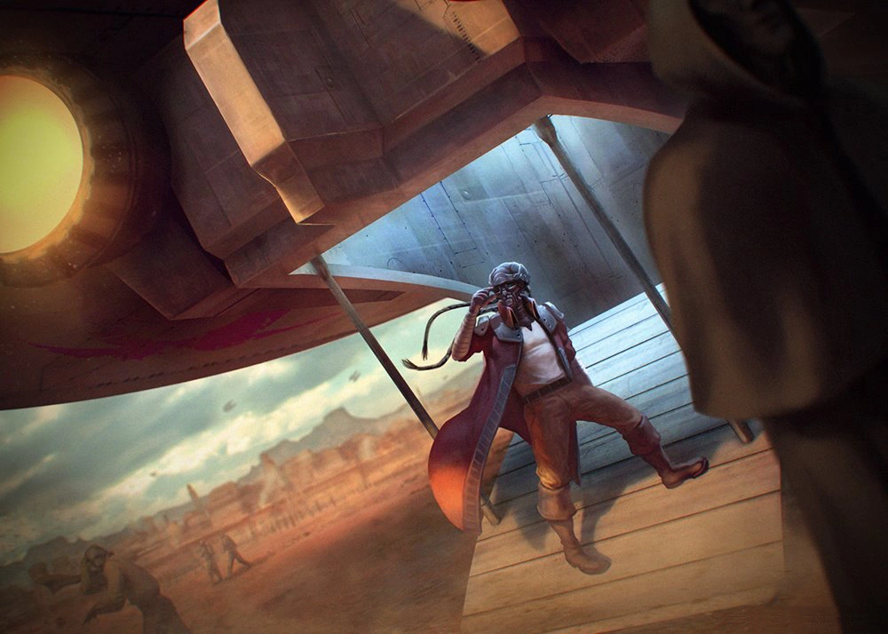 After the Battle of Crait, a decisive confrontation of the First Order-Resistance War, Ohnaka was stationed at Bakkar Spire in Black Spire. At some point, the Millennium Falcon landed on Batuu, where Resistance members established a base outside the outpost. Ohnaka made a deal with Chewbacca to use the ship, and hired a temporary crew to take part in one of Ohnaka's jobs, where they were tasked with hijacking a First Order train containing coaxium.[57]