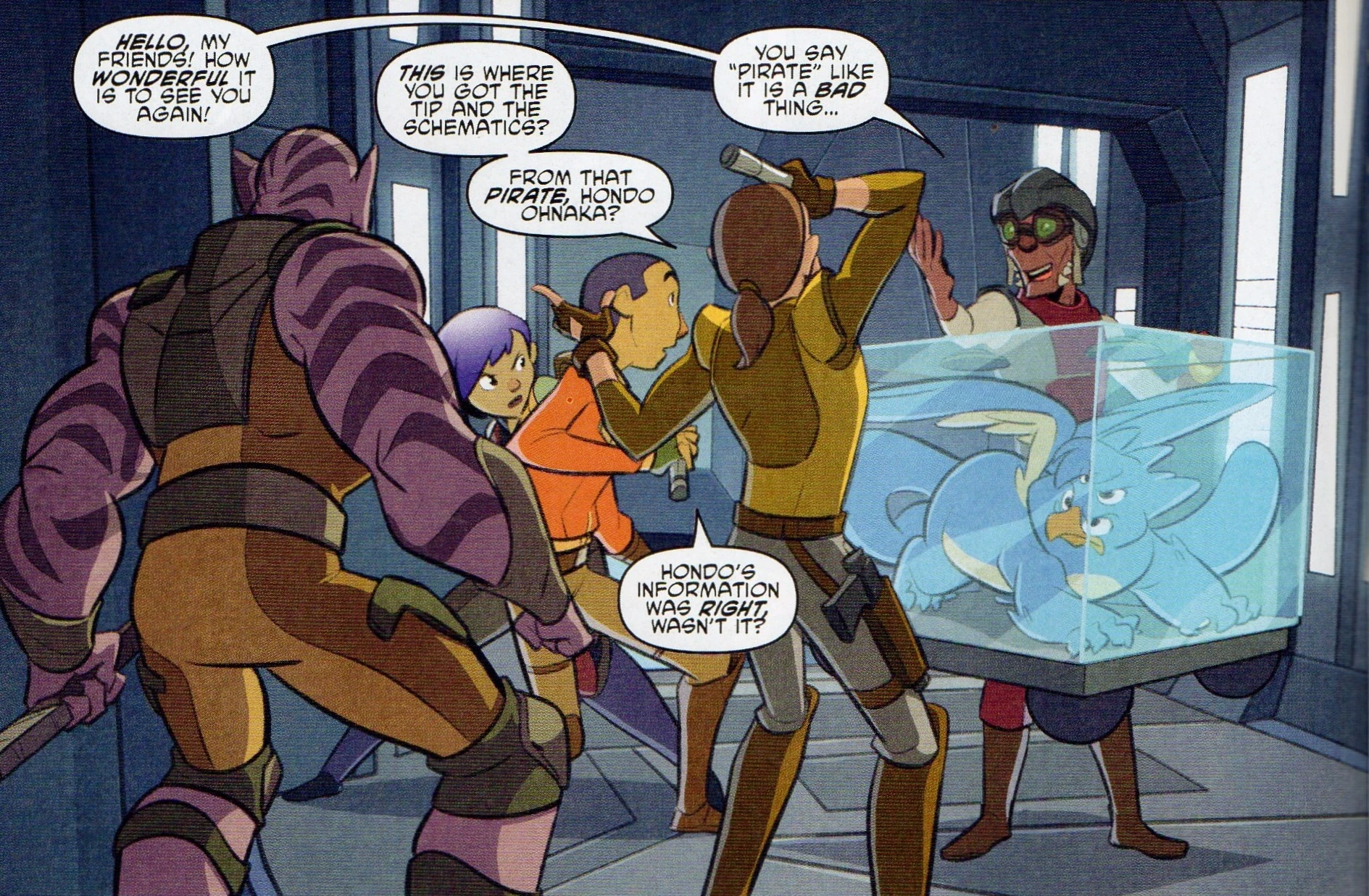 After boarding the station, Hondo and the rebels encountered several Ugnaught laborers including Melch. While Ezra wanted to ignore them, Hondo spoke to the Ugnaughts and told them that he was Terba's friend and that the rebels had come to liberate them. Ezra then asked Hondo to convince Melch to shut down the conveyor belt. Following a skirmish with Imperial stormtroopers and dismantler droids, the rebels, Hondo and the Ugnaughts managed to steal five Y-wings. Hondo and the Ugnaughts followed Ezra to the command center but stopped to guard an Imperial landing craft in the hangar. After the station began to collapse, Hondo and his Ugnaught allies took the shuttle and fled offworld. Before leaving, Hondo contacted Ezra to thank him and his friends for rescuing him.[39]