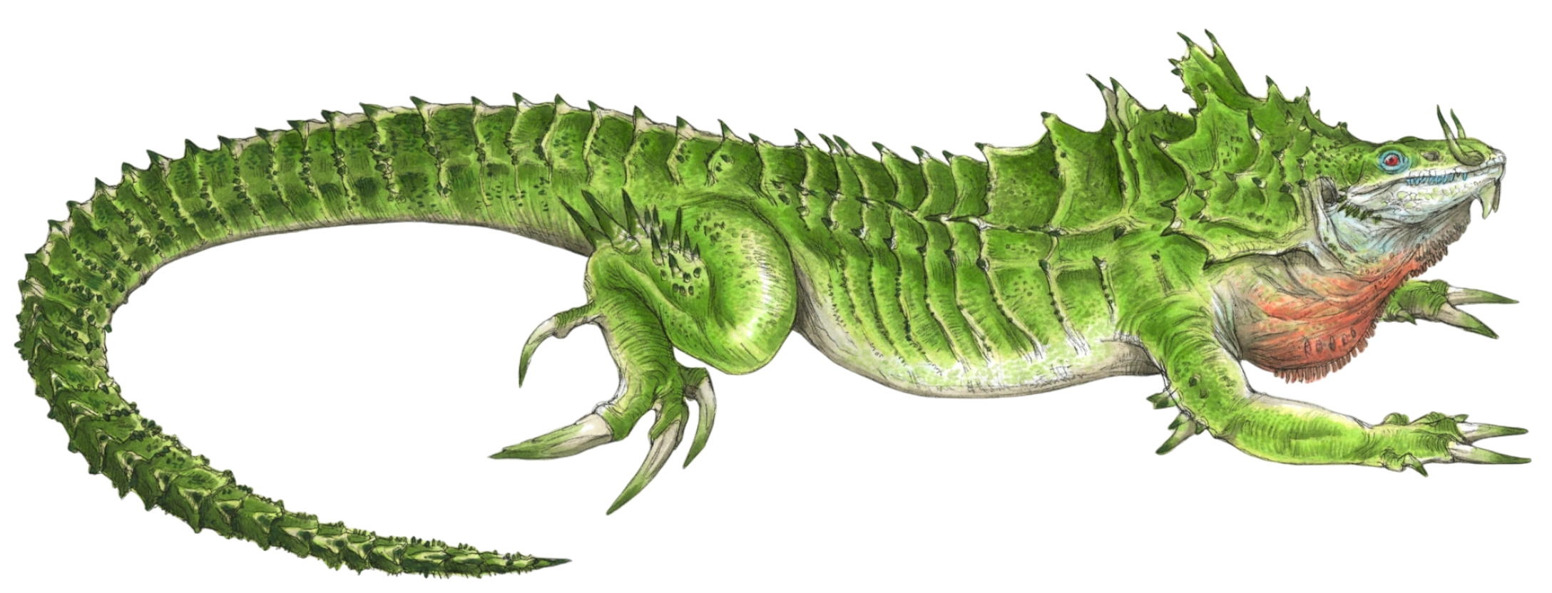 In appearance, Hssiss looked like nothing more than particularly vicious reptiles, about three meters in length, with a green, scaly hide. In addition to those three meters, they had a meter long tail, covered in rows of spikes which stretched up past their backs and onto their necks. When in the lakes on Ambria, they hunted in pairs, grasping their prey with their strong jaws and sinking dozens of teeth into the unfortunate animal's body, while the other Hssiss sunk its jagged claws into it.