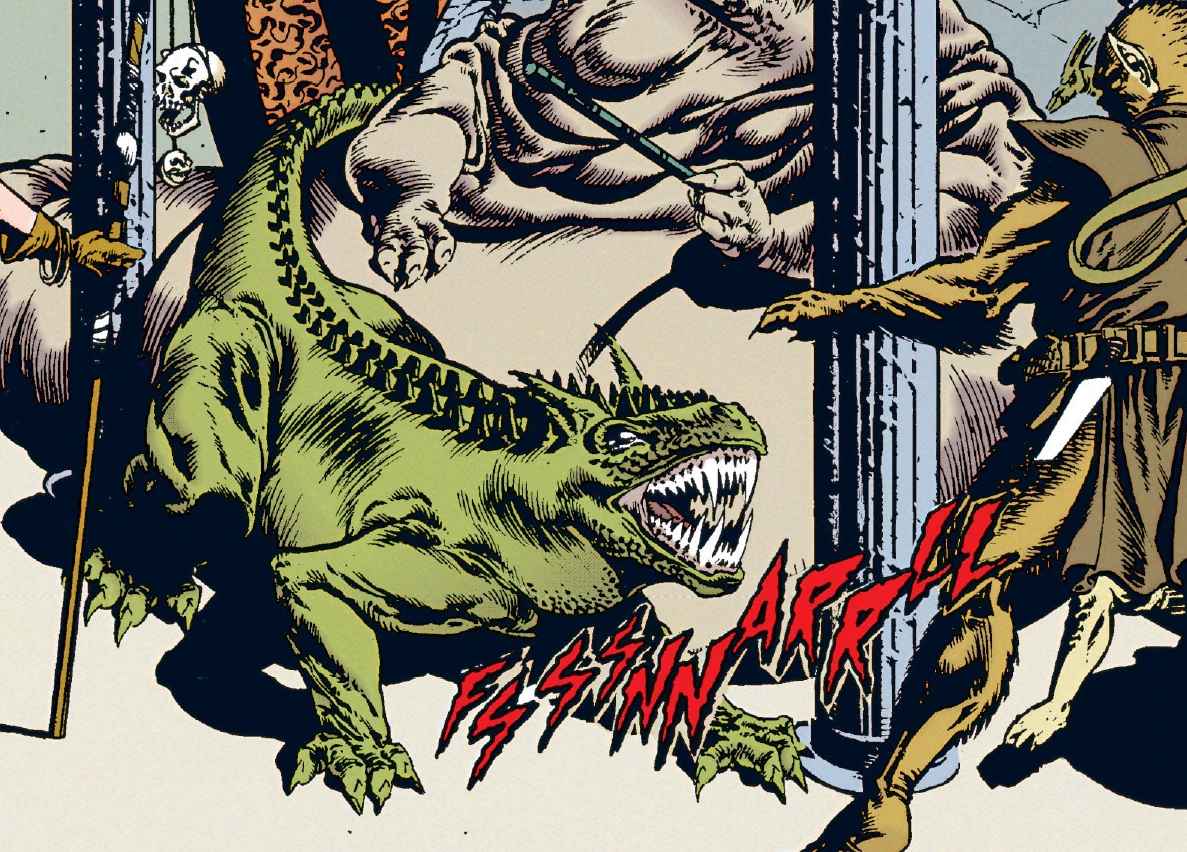 Hssiss originated as savage reptilian predators on Ambria, and were one of the few creatures to survive the planet's destruction. They lived in and near Lake Natth, where Jedi Master Thon had imprisoned the dark side energies that had plagued the planet for millennia. The dark spirits then began to possess the creatures, turning them into something much fouler—it was said that these "dark side dragons" aided those who used the dark side of the Force. Eventually, Great Bogga began to use them as body guards and pitted them against those who had failed him. When he realized how effective and vicious they were, he had them transported off-world and sold in bulk. Soon, Hssiss could be found all over the galaxy, especially on worlds where the dark side was strong, including Korriban[4], Mimban[5] and Vjun. They would eventually be used by the Sith as warbeasts.[6]