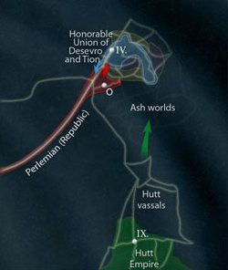 This empire was based mainly in the Outer Rim though it also covered a portion of the Mid Rim. The Hutt Empire was near the Tion Hegemony and occasionally both fought.