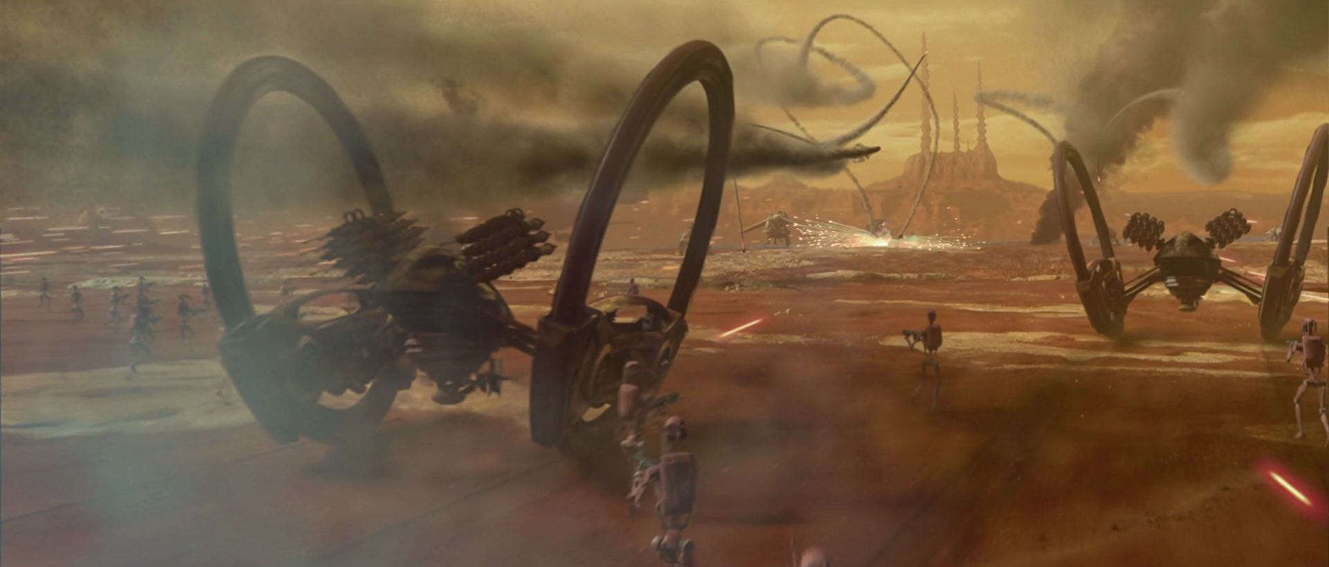 Hailfire droids advance on the Grand Army of the Republic during the Battle of Geonosis