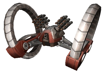 Hailfire droids were equipped with two racks of long-range "Hailfire"[3] missile launcher pods on either side of their heads, each carrying 15 guided missile warheads[1] that left behind a trail of black exhaust when fired.[7] These projectiles were effective against stationary or slow-moving targets on terrain where blaster weapons were unusable due to a lack of clear lines of sight,[5] with a single warhead being capable of destroying a Low Altitude Assault Transport/infantry or an All Terrain Tactical Enforcer.[1] The missiles were most effective at ranges less than a kilometer and followed deliberately swerving, evasive trajectories, and when they were depleted,[5] a hailfire droid was forced to rely upon its forward-mounted twin auto-blaster.[3]
