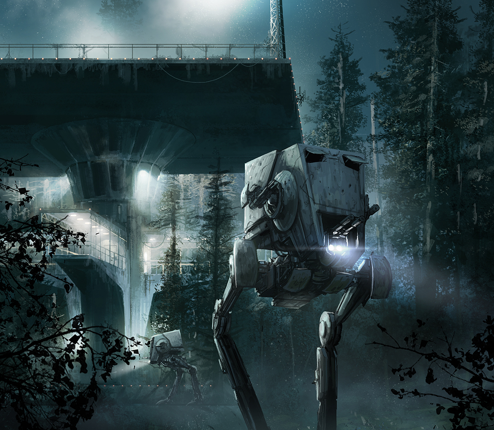 AT-STs patrol the garrison base on Endor