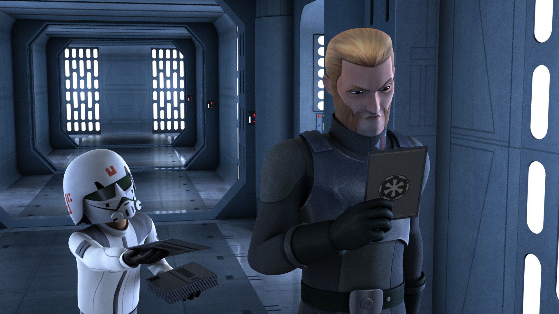 Following the failure of local Imperial authorities to apprehend the Spectres, Grand Moff Wilhuff Tarkin landed in a shuttle at the Imperial Complex and chastised Minister Tua, Agent Kallus, and the Grand Inquisitor for their failings. He later summoned the Imperial Academy's Commandant Cumberlayne Aresko and Taskmaster Myles Grint and executed them as a warning that failure would no longer be tolerated. Tarkin then devised a plan to trap the Spectres at the Imperial Communications Center near Jalath.[6]