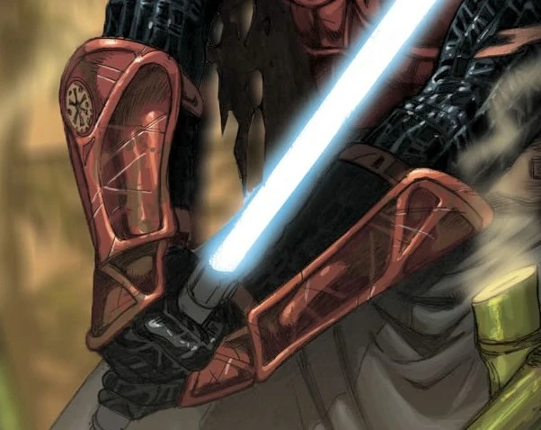 Imperial Knight armor was designed for the Star Wars: Legacy comic book by Dark Horse comics. The armor shows a striking similarity to that of the Emperor's Royal Guard, especially that worn by Kir Kanos in the Star Wars: Crimson Empire comic book series, also by Dark Horse, as Kanos was often portrayed without a helmet. The cortosis gauntlets of the armor are similar to the vambraces worn by Zayne Carrick in the Star Wars: Knights of the Old Republic comic book, but have different properties. Carrick's vambraces were capable of deflecting lightsaber strikes, while Imperial Knights' cortosis gauntlets deactivated lightsabers for a short period of time. Penciling or coloring mistakes sometimes portray variations of the standard Imperial Knight armor in the comic, such as Roan Fel's gloveless gauntlets in a panel of Legacy (2006) 13.