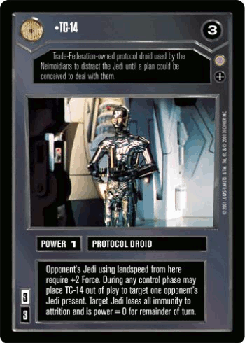 The two Jedi were scheduled to meet with Viceroy Gunray immediately after arriving at Naboo in the starship Radiant VII. However, TC-14, the hostess protocol droid which they encountered first, promptly informed Gunray, his lieutenant, Settlement Officer Rune Haako, and invasion force Captain Daultay Dofine, that the ambassadors from Coruscant were Jedi Knights. Terrified at the prospect of facing Jedi, and Dofine having realized beforehand that the Jedi had most likely been sent to force a settlement regarding the dispute, Gunray contacted Sidious and presented the situation, also sending TC-14 to distract them due to Dofine being unwilling to face them. Jinn also noticed that there was an unusual amount of fear among the Neimoidians, especially for what was apparently as minor as a trade dispute. Sidious, realizing Valorum's role in bringing the Jedi to the ship, ordered Gunray to kill the Jedi at once and begin landing his troops on Naboo for an invasion, and when Gunray questioned the invasion's legality, Sidious replied that he would make it legal. Sidious also told Gunray to make sure that any future contacts to him exclude Dofine from participation after the latter implied they should call off the plan due to fear of the Jedi. In order to ensure the Jedi couldn't escape even if they did survive the dioxis, the Saak'ak's docking bay fired its turbolaser turrets at the docked Radiant VII, destroying the ship before its captain could give the order to ready its shields.[10]
