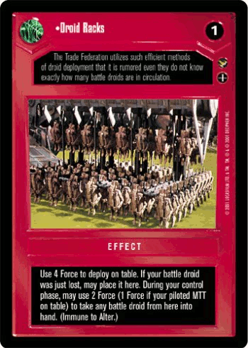 An ever-expanding trading alliance, the Trade Federation, headed by the Neimoidian Viceroy Nute Gunray, would purchase victories in the Galactic Senate with their immense resources. As an independent entity, they even had their own senator, Lott Dod, and went so far as to "persuade" the weapons inspectors of the Galactic Republic to ignore the arming of their onetime cargo craft. Secretly, the Federation had converted these shipment vessels into lethal battleships. The modifications were made ostensibly to defend against increasing pirate activity in the Outer Rim Territories.[11] Following the buildup, the battleships and battle droids largely replaced the Trade Defense Force and its marine forces.[8]