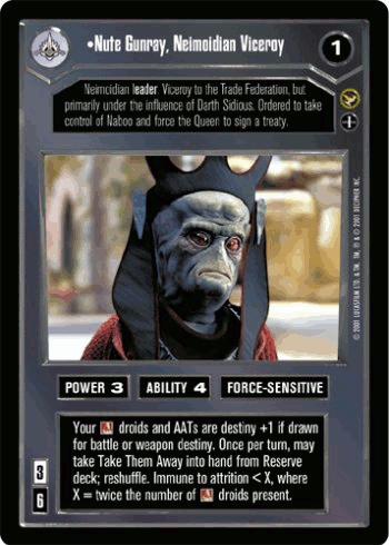 Viceroy Nute Gunray of the Trade Federation was a longtime ally of Darth Sidious. Following the death of the Trade Federation Directorate members on Eriadu, Gunray advocated striking back, but Sidious convinced him to target Naboo, a world which could not strike back.[23] During the invasion, Gunray questioned the legality of landing ground forces, but was quickly rebuffed. Gunray also had doubts when Sidious was sending Maul to join them. Gunray tried to force Amidala to sign the treaty, but at the end of the invasion, it was he who had to negotiate.[10]