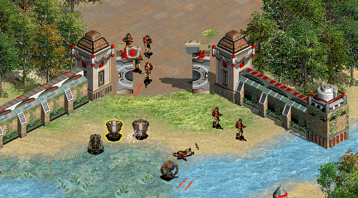 Naboo mounted troopers rode kaadu in Galactic Battlegrounds,[1] which were replaced with Tusk cats in the 2002 expansion Clone Campaigns.[3] Near the Naboo Royal Navy, the player may find two Gungan-affiliated glurrgs farming. However, an encounter with them would be non-canonical, as according to the game, the Trade Federation did not learn about the existence of the Gungans until after the Fall of Theed. Several unused audio recordings are included in the files for the level. Several feature a Naboo trooper—whose voice is distinct from that of the royal trooper who surrenders to the player—warning that the Trade Federation not to come any closer. In other recordings, Gunray informs the player that the Sith Darth Maul has arrived and that he can help the player take control of several buildings.[1]