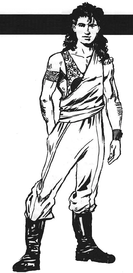 Irek Ismaren was a wiry, slender young man[5] with aristocratic features, distinguished by a prominent nose.[44] He had curly shoulder-length black hair, the same color as his mother's,[5] and eyes of a sea-blue color.[44] His skin was slightly golden in color, but due to spending the majority of his life in the underground city of Plett's Well[5] and in an underground laboratory on Coruscant,[36] his skin was pale from lack of sunlight.[5][44] Due to his training, Irek had a great knowledge of technology, and by age thirteen, he could qualify for a number of scientific degrees.[39] He could also read and write Binary and also speak it.[47] Following his transformation into a cyborg, Irek was no longer slender, having developed increased muscle mass and height through growth hormones and cybernetic stimulation. He had plates of armor surgically installed in his torso, elbows, knees, and head,[35] but was still recognizable by his curly black hair.[44] Additionally, due to being kept in suspended animation during his transformation, his aging was suspended, and despite being around thirty years of age in 27 ABY, he was physically younger, with the look of a youthful man.[36]