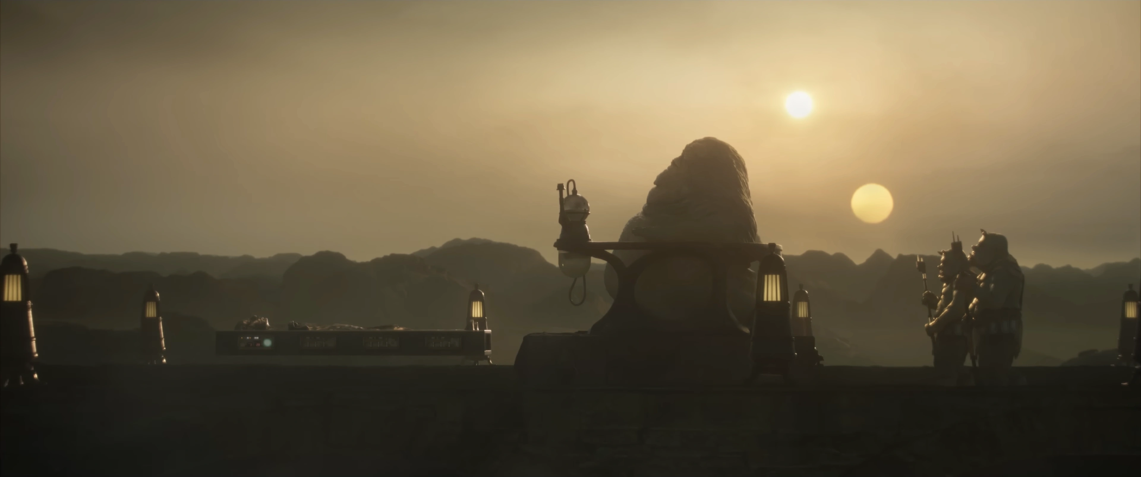 Jabba and Solo discuss the smuggler's debt in Mos Eisley.