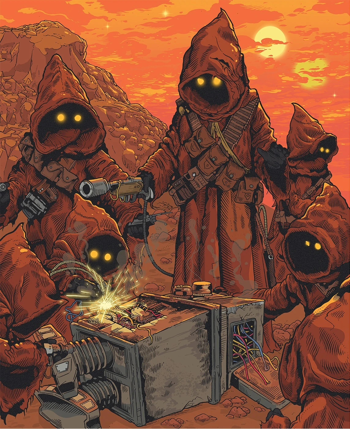 A group of Jawas scavenging a power droid