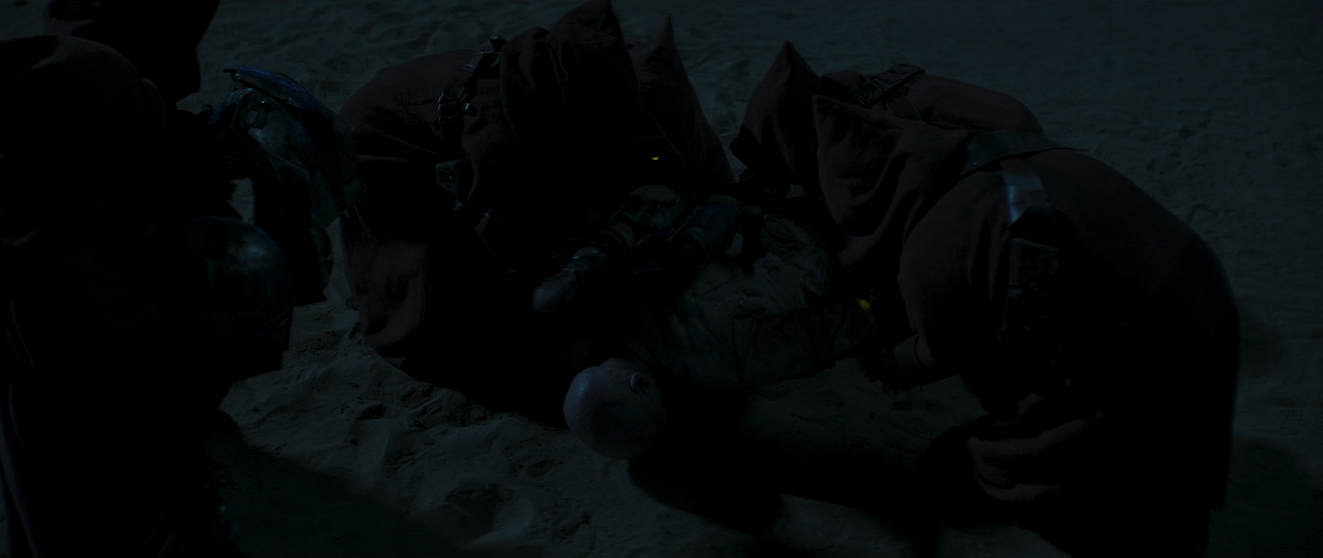 Jawas steal Boba Fett's armor, as he is lying on the desert ground