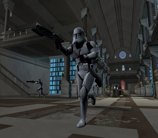 While the Archives had always had very heavy security to prevent hacking from outsiders, the agents of the Galactic Empire failed to maintain the anti-tampering measures. Determined Jedi, such as Ekria hacked the databases from elsewhere on Coruscant and deleted all record of herself, and her fellows, Zonder and Drake Lo'gaan.[29] Sealed behind great black doors, the Archives was now impenetrable from all but the Empire. However the Empire's security was put to the test when Darth Vader sent his secret apprentice Starkiller to the abandoned complex to complete the Jedi Trials. After getting past the heavy doors installed by the Empire, Starkiller entered a damaged hall of the Archives, slaying all the troopers stationed within. Because of the extensive damage in this wing, the assassin was forced to go through the databank room that contained the large supercomputers capable of storing the information for the holobooks. After reentering the Archives proper, Starkiller was forced to duel the Trials' program, which had taken on the guise of Darth Phobos. After she was defeated, Starkiller left the damaged hall and the Temple. When security crews returned, they quickly locked the Archives down, sealing it off to everyone but Sidious. The Jedi Archives were then vigilantly guarded by Imperial Senate Sentinels and shadow troopers, in constant wait for returning Jedi.[30]