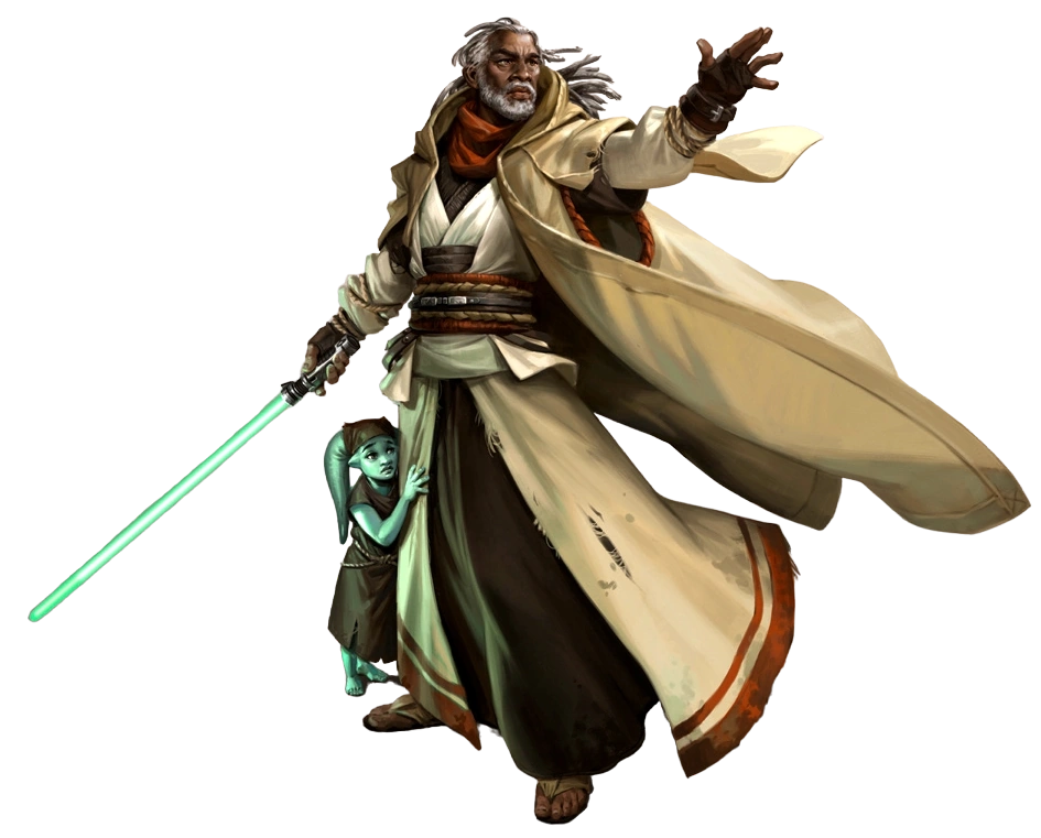 A Jedi Consular defends a Twi'lek child.
