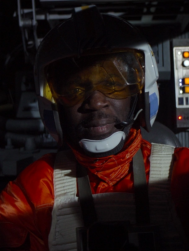 Dodger wore an orange and white flight suit and a white K-22995 light flight helmet with blue and yellow markings and two New Republic roundels.[1] He also wore a brown jacket.[3]