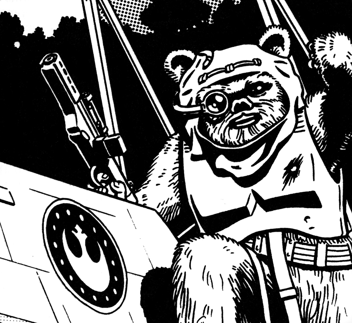An image of an Ewok pilot from 1993's Star Wars Gamemaster Handbook, predates the character of Kettch by several years. The image is in itself canon in the Legends continuity, and may have even inspired the Kettch plotline, but it is not clear whether it should be seen as a portrait of Wraith Squadron's stuffed Ewok, or whether it reflects a real Ewok pilot like Kolot or Tarfang.