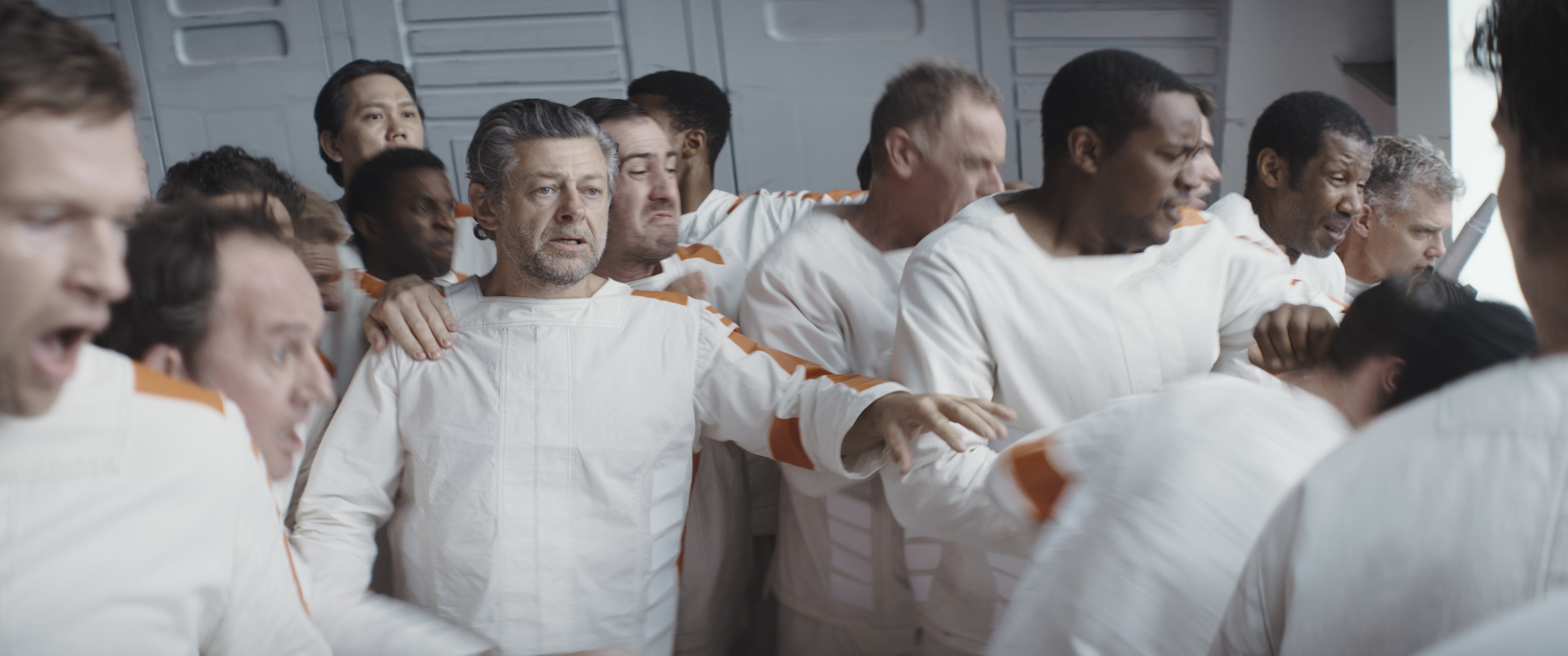 Serkis and the actors would walk on metal plates with bare feet, which drained their energy. Serkis said the costume design, prison outfits, and the set worked on him psychologically and took away his sense of identity.[17] He felt that the set design was phenomenal and made him feel like he was in what he called a strange kind of experiment.[15] For many scenes, Serkis and other barefoot actors played characters who would spend hours waiting in long tubes in the prison. Serkis viewed the experience like walking into a big test tube because of how smelly the tubes would get.[14] Serkis and the actors would have to stand because there was no room for private space, which made him feel incarcerated.[17] Serkis enjoyed his time filming, as well as working with Haynes[12] and Diego Luna.[15] Serkis liked performing the "never more than twelve" line, which he viewed it as a beautifully written transitional moment for Loy. The actor figured that Loy had a hard time delivering the rousing speech[14] in the episode "One Way Out"[3] because he knew he could not swim away from the prison. Serkis thought that Loy had a wonderful arc, and he enjoyed going on a journey with his character.[14]