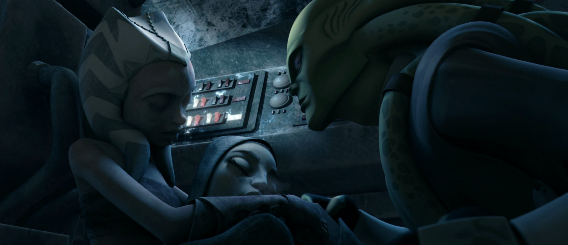 Kit Fisto finds a freezing Ahsoka Tano holding an unconscious Barriss Offee.