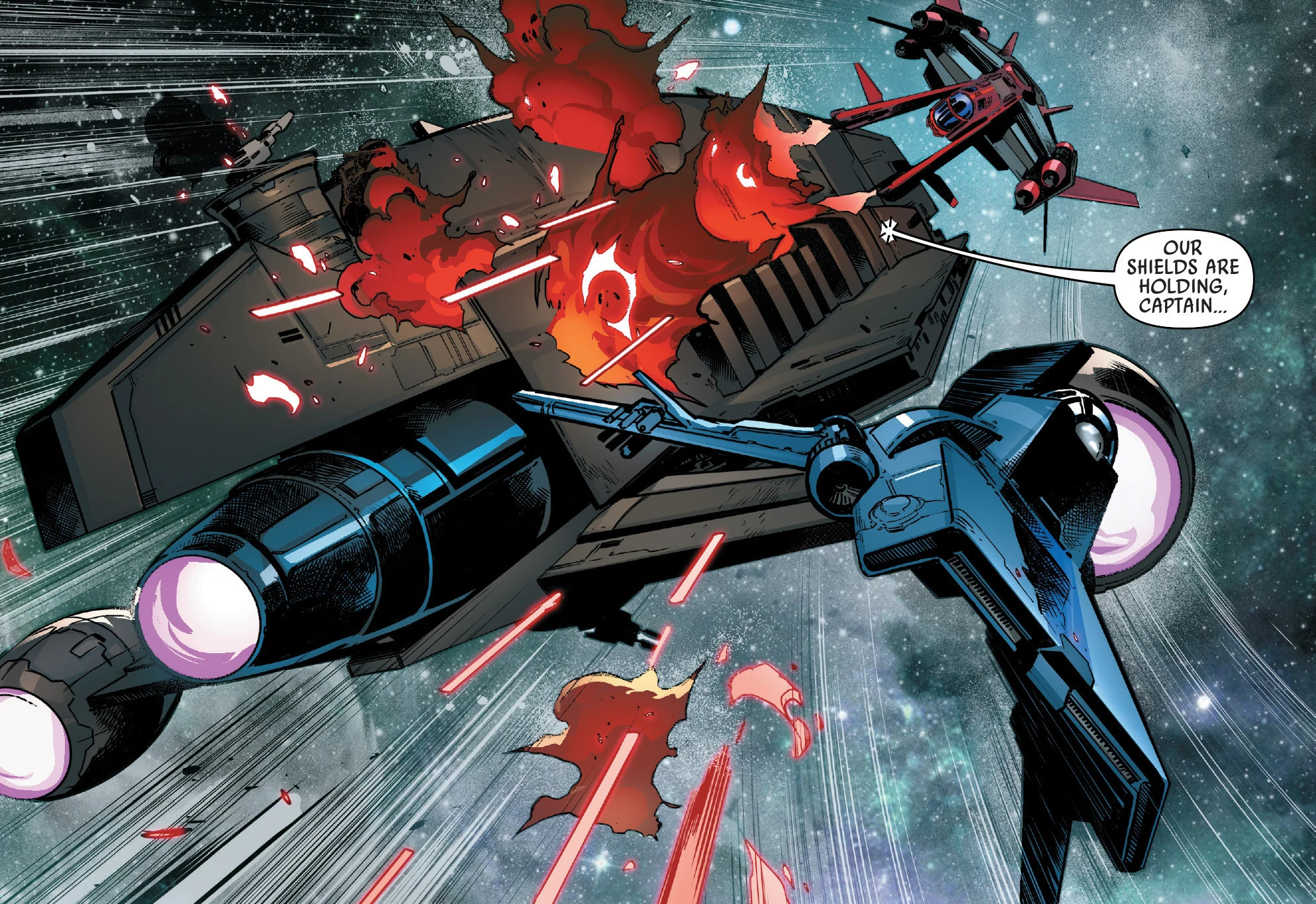 The pair of ships emerged from hyperspace soon after, and near the Imperial cruiser. Dume, however, managed to eject himself from the cruiser's airlock using the Force and was sucked into the vacuum of space. Kasmir quickly pulled the Padawan into the Kasmiri and revived him. The cruiser raised its deflector shields and prepared to attack, so Kleeve and Kasmir did likewise in their vessels. Kleeve asked Kasmir why men such as them—criminals—were risking their lives for Dume, a child. Kasmir replied that he did not even pretend to understand that. Kleeve was relieved that it wasn't just him, and attacked the cruiser. Both pilots quickly learned, however, that they were hopelessly outmatched, so they began to retreat. Although, Dume ordered them to stay and fight. Kleeve and the Kalleran obeyed, even when both their vessel's shields fell to single digits. With little choice, the Devaronian and Kasmir followed Dume's instructions and looped around to strafe the Imperial ship. They opened fire and the cruiser unexpectedly exploded; killing all aboard. The two ships then landed on Kaller to regroup.[12]