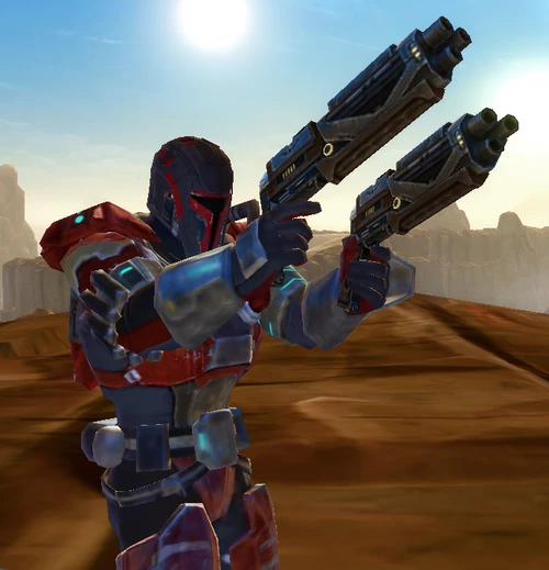 He wore gray and red Mandalorian Seeker armor.