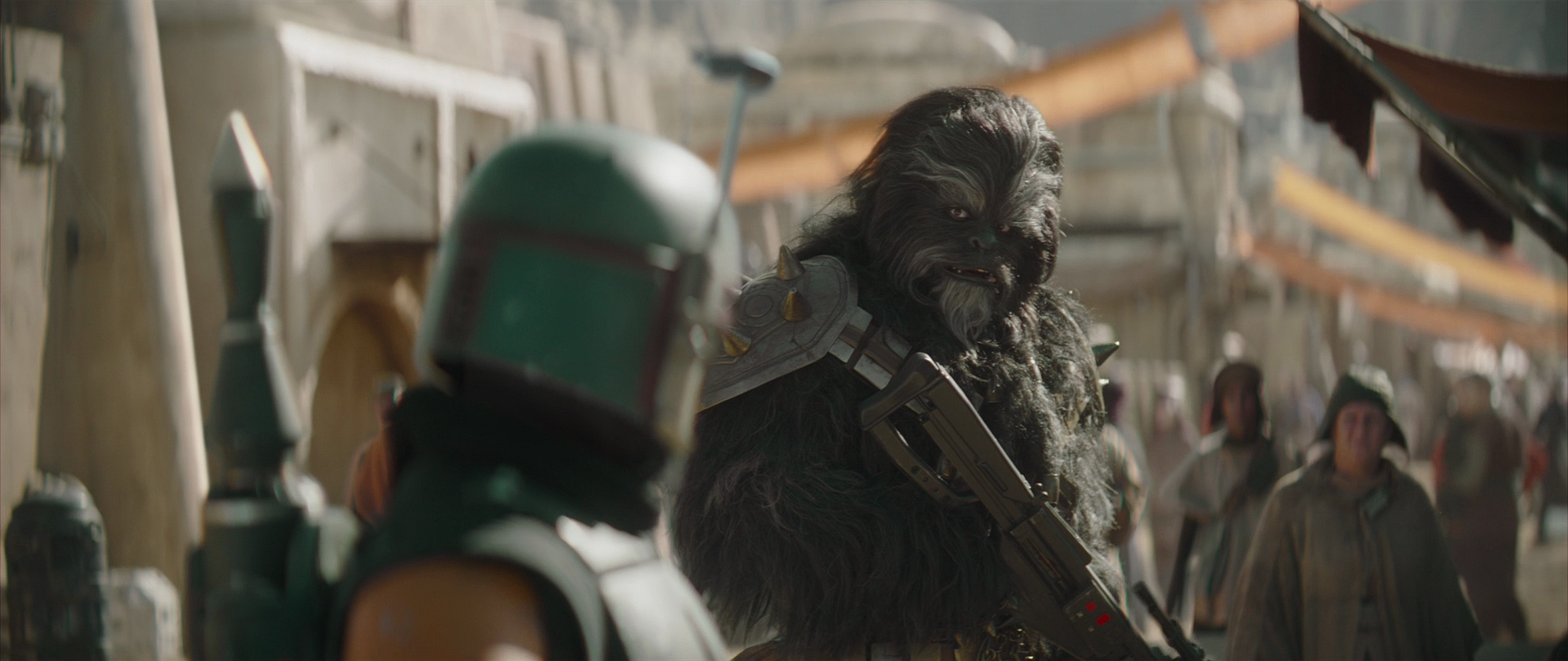 Krrsantan still tried to power his way through the pain, but after another shot to his already injured right leg, he collapsed. Fett and Djarin ran to Krrsantan's aid, taking most of the fire from the Pykes. Helping Krrsantan to the landspeder, Fett welcomed the Wookiee back and was impressed he was still alive, promising him a bacta tank soak after the whole ordeal was over. While resting and recuperating, the Fett gotra fought against the Pykes in a large shoot-out. Then the Pyke forces suddenly retreated and two large Scorpenek annihilator droids approached, armed with two heavy turrets and a shield generator. Boba Fett and his allies failed to penetrate their shields. Blasting the landspeeder, Krrsantan followed the people of Freetown as they ran towards the Worker's District to seek shelter.[35]