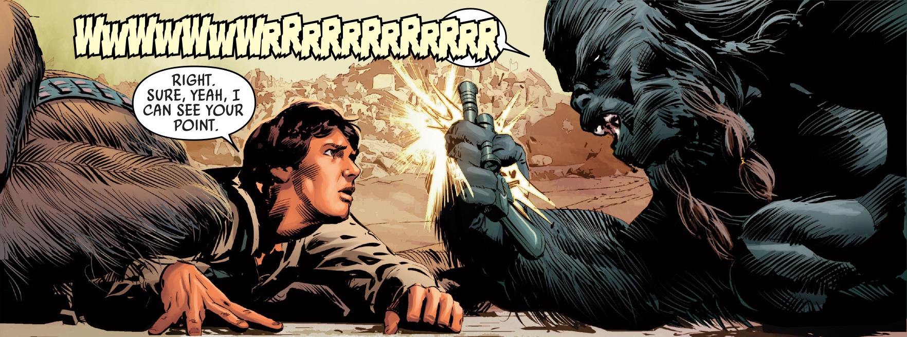 Krrsantan takes Han Solo's pistol.