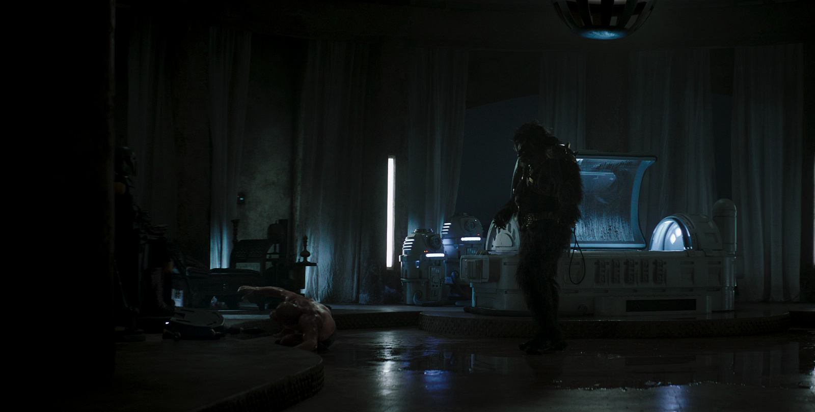 However, Fett's newly recruited street gang arrived and attacked Krrsantan, surrounding and engaging the Wookiee in melee combat. The bounty hunter knocked two to the floor and hit Fett into his bacta tank when he pulled the gaderffii stick out of his back. When Fett's two Gamorrean bodyguards came, Krrsantan tackled them both down the stairs to the throne room and used his strength to knock them around, biting one of them. The street gang returned to face the Wookiee when Fett's Master Assassin Fennec Shand intervened and activated a trap door below Krrsantan. The bounty hunter managed to grab onto the floor with one hand, but Shand threw a knife directly at Krrsantan's fingers which caused him to plummet down into Jabba's former rancor pit, where he found himself trapped.[33]