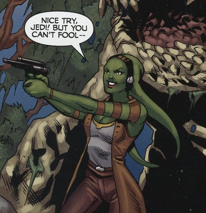 Kuvuta Pindi was a green-skinned Twi'lek woman.[2] In 22 BBY,[1] as part of a slavery operation, she abducted 10 war orphans from Abregado-rae and took them to the planet Fondor. There she posed as the younglings' blind handler, and she fooled the Jedi Nuru Kungurama and the swoop biker Gizz into taking them to the placement center on Foless. On the trip to the planet, Gizz flirted with Pindi. On Foless, Pindi directed the orphans to take a particular-colored airbus. This clued Gizz and the Jedi that she was faking her affliction, and gave chase. Once they caught up, she accosted her partner, the pirate Dool Pundar, to try to deceive the Jedi that she had been abducted. The airbus crashed, and Pindi continued to lie about her blindness. In a moment of distraction, she took the orphan Charky hostage with a hidden knife, although the young Trandoshan bit her and forced her to resort to running away. Gizz and the Jedi pursued her into a swamp, which was marked with a "danger" sign. Drawing a blaster, she was about to shoot Gizz for ruining her plans, when a creature rose up behind her and devoured her, although Kungurama tried to warn her. Pundar was subsequently taken into custody and the orphans were placed with new families.[2]