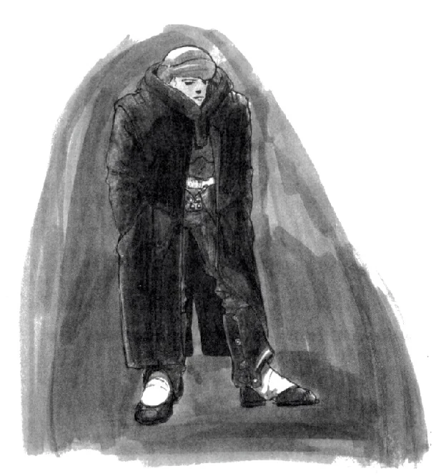 He spent his first day on Trid in recon work, passing by a square and walking towards the Facility. He briefly considered abducting a scientist and used them to gain access but he discarded it. He had a strange premonition that he was followed; and entered a cafe to rest and scan the environment, and indeed saw a familiar figure distantly; he didn't recognise that it was Jan stalking him. Eventually he reached the security perimeter near the Research Complex and pretended to be exercising, but as he wasn't dressed for it, he took a quiet street and retraced his way back to the spaceport, buying food from a street vendor. He confirmed that it would be impossible to enter without help from inside and he remembered Meck, and his choice between friendship and duty. After some dinner in the Crow, he slept and had a nightmare: he was a Rebel on AX-456 shooting Stormtroopers who poured from the hatch, and all bodies had Meck's face under the helmet.[12]