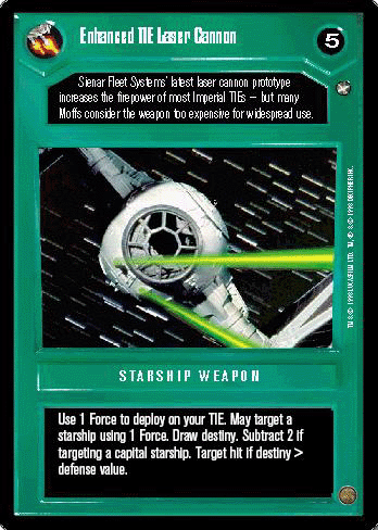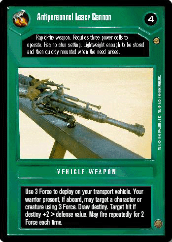 A laser cannon was the standard weapon for use by most starships and other vehicles. The amount of destruction a laser cannon could do depended on its wattage. Cannons on the famous X-Wing ranged from 126 terawatts to 500 terawatts. Turbo laser cannons on Imperial Star Destroyers were upwards of 3,000 terawatts. It existed in a myriad of forms, from the huge versions used by starships, through medium-sized turret-mounted variants, to the much smaller personal cannons sometimes carried by infantry. Although they were capable of causing a considerable amount of damage, they were no match to some of the more advanced beam weapons such as electromagnetic plasma cannons, turbolasers and superlasers.