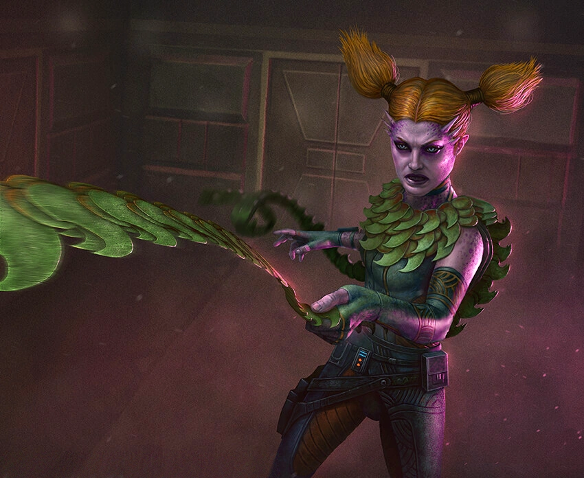 At a station above Quarzite, Rigosso explained that their job was to protect a chest of unknown contents on a subtram to Belugan leader Otua Blank. While some of the other hunters were curious what was inside the chest, Razzi dismissively replied that she did not care as long as they got paid. While delivering the chest, Razzi was partnered with Highsinger to stay with the chest while Boba and Bossk guarded the engine room and Dengar and Ventress were positioned at the rear of the tram. Soon after their departure, she and her partners were attacked by numerous Kage Warriors. Razzi fought alongside C-21 Highsinger, fending off many Kage Warriors by matching their skill in martial arts and using her grappling boas to great effect. Soon, she and Highsinger were attacked by the Kage leader Krismo Sodi. After matching the skilled warrior in hand-to-hand combat, Razzi pulled out her grappling boas again, swinging them at Sodi. However, the Kage ducked, and Razzi accidentally snared her partner Highsinger. Sodi then shoved Highsinger backwards, causing the pair to fall off of the tram.[4][7]