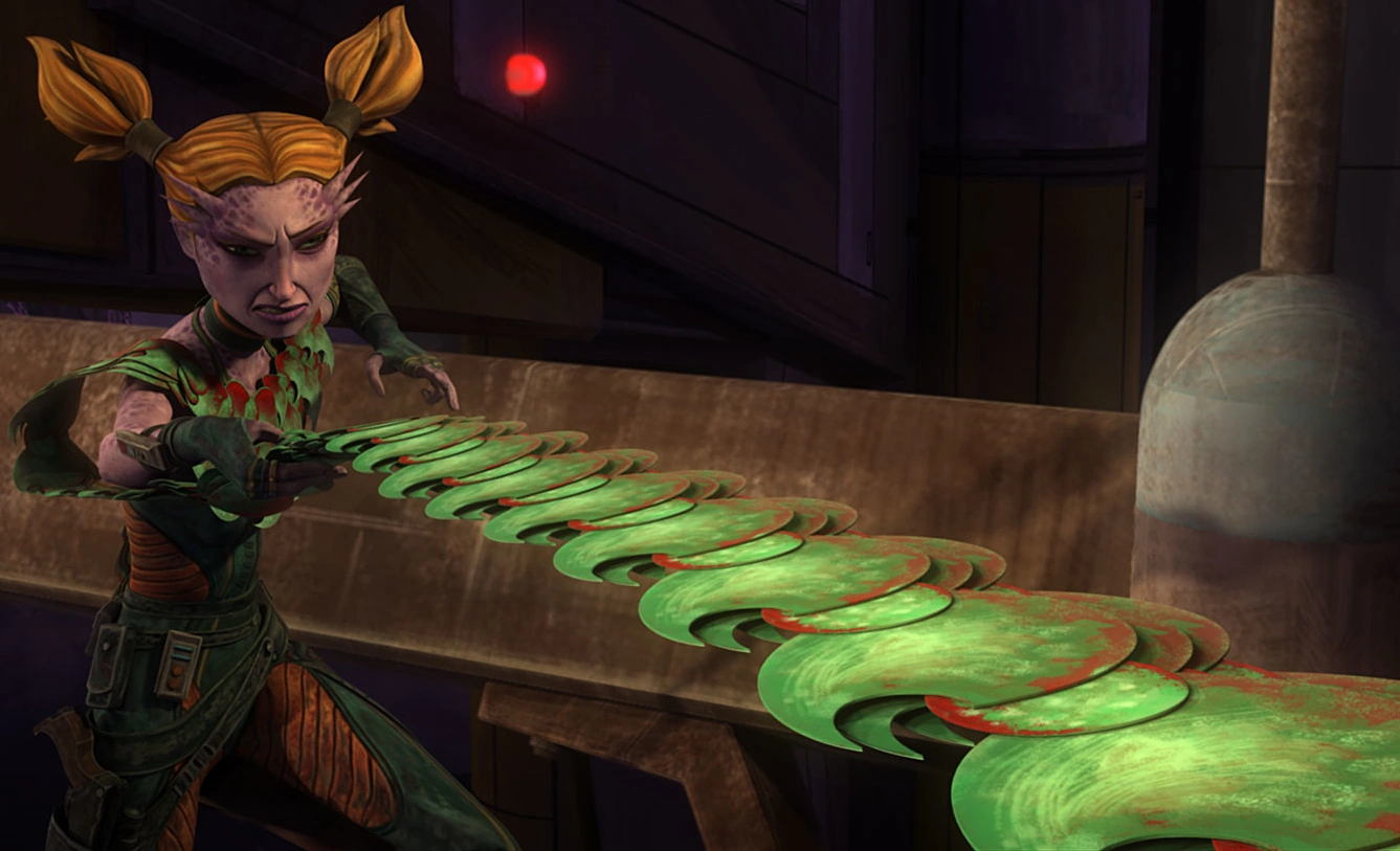 By the second year of the Clone Wars, the Kyuzo Embo had joined the team. Razzi and the rest of the syndicate members were present in a bar on Coruscant's Level 1313 when the undercover Jedi Master Quinlan Vos visited asking for information on how to find Asajj Ventress, a bounty hunter who had once been Count Dooku's Sith apprentice. Vos had been assigned by the Jedi High Council to assassinate Count Dooku and had decided to enlist Ventress as his partner. When Fett claimed that Ventress had cheated him, Latts pointed out that she had not cheated them and that they had been paid, but not in a way that pleased Fett. Fett reluctantly revealed that Ventress was pursuing a Volpai fugitive named Moregi on Pantora.[3]