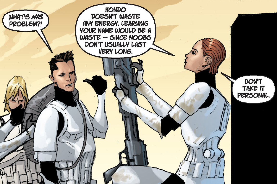 Anson Trask, Ran Harkas, and a newly-staffed Joker Squad go on to play minor roles in Legacy's sixteenth, seventeenth, and forty-eighth issues,[39][40][41] as well as issues three and four of the followup miniseries Star Wars: Legacy—War.[42][43] Hondo Karr reappears in Legacy's twentieth and twenty-first issues as a new recruit in the Galactic Alliance Remnant's Rogue Squadron,[44][45] but he deserts his post in the series' forty-first issue, which also reveals through flashbacks how he first joined the Jokers.[46] The word "noob" appears again in Legacy (2006) 14, spoken by Captain Gunn Yage of Darth Krayt's Empire.[47]