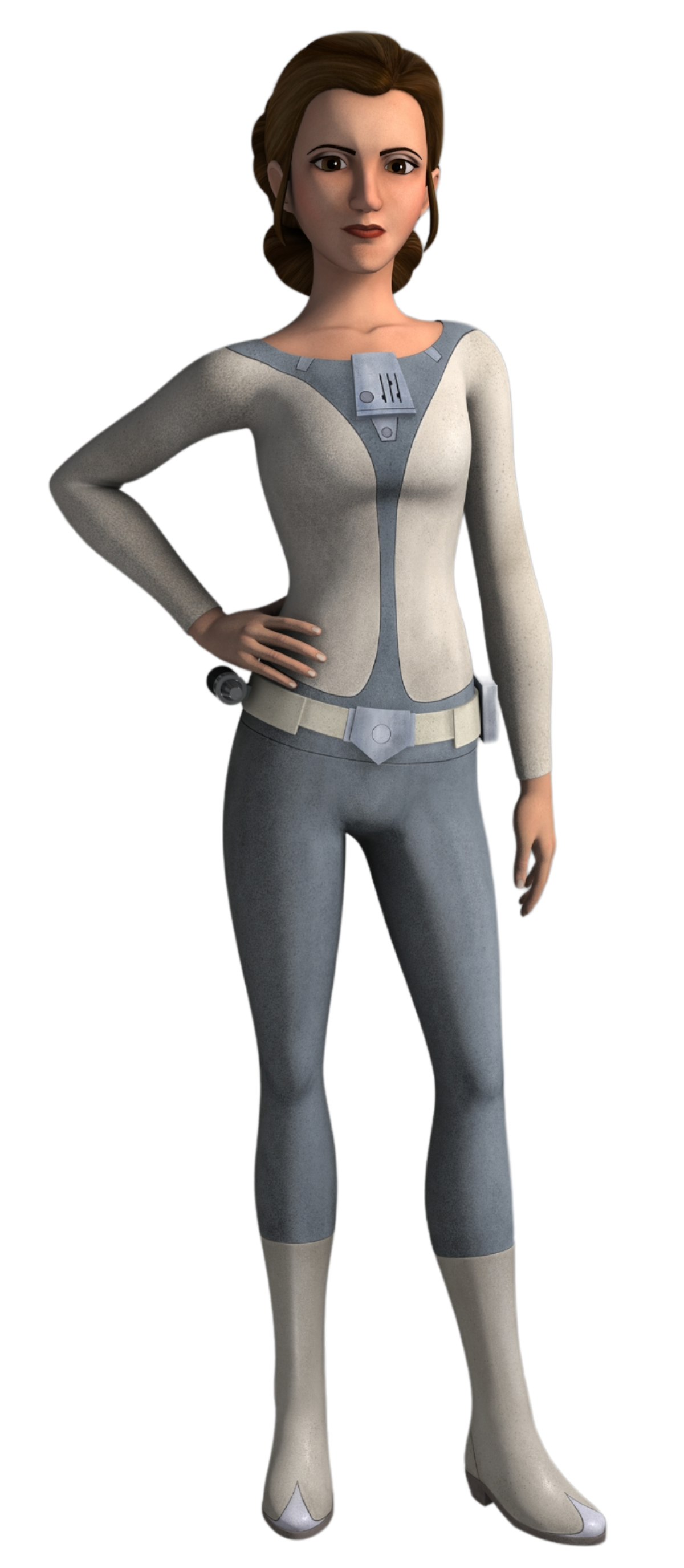 Of commanding presence[34] and remarkable leadership, adult Organa was a brave and sharp-witted diplomat who was unafraid to speak her mind, even when confronted by powerful figures like Darth Vader and Grand Moff Tarkin.[9] Organa was also able to keep her composure even in humiliating situations to perform daring feats, like diving into a garbage chute or strangling the infamous Jabba the Hutt.[9][11] However, she was also capable of quieter acts. Growing up in the early days of the rebellion, she became skilled at keeping secrets, a trait beneficial to the greater good but detrimental to those around her.[50] Her close friend Raymus Antilles recognized her as an ever-enigmatic individual, never revealing more than was necessary to her allies to ensure their protection.[63]