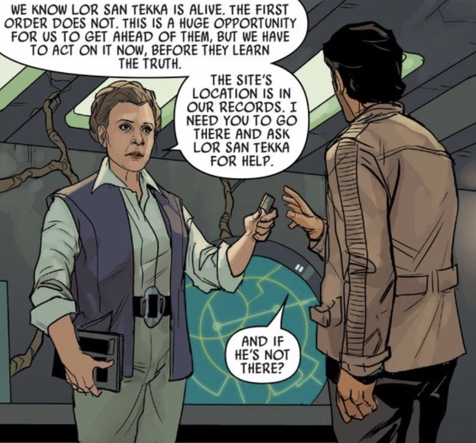 Leia immensely regretted that her actions on the first Death Star indirectly led to the destruction of her homeworld. She was conscious of the fact that she alienated many people because of that. Constantly questioning whether she did the right thing, she came to the realization that she would willingly sacrifice those innocent lives again if it meant stopping the Empire. In her eyes, the cause was greater than any one person.[112] She stated to Ellian Zahra that she didn't kill to settle scores, control people, or make them afraid, but only when she had no choice and always in the name of justice.[228] As Leia grew older, however, she placed more value in protecting lives than destroying her enemies; "jumping in an X-wing and blowing something up" could not be a winning strategy against forces like the First Order if there were no people to fight for the cause. She had the wisdom to realize that the Resistance having a leader with this foresight was better than having a hero who took unnecessary risks.[182] Aware of how others looked to her for leadership, she looked to other members of the Resistance like Poe Dameron to take on these responsibilities when she was gone.[50]