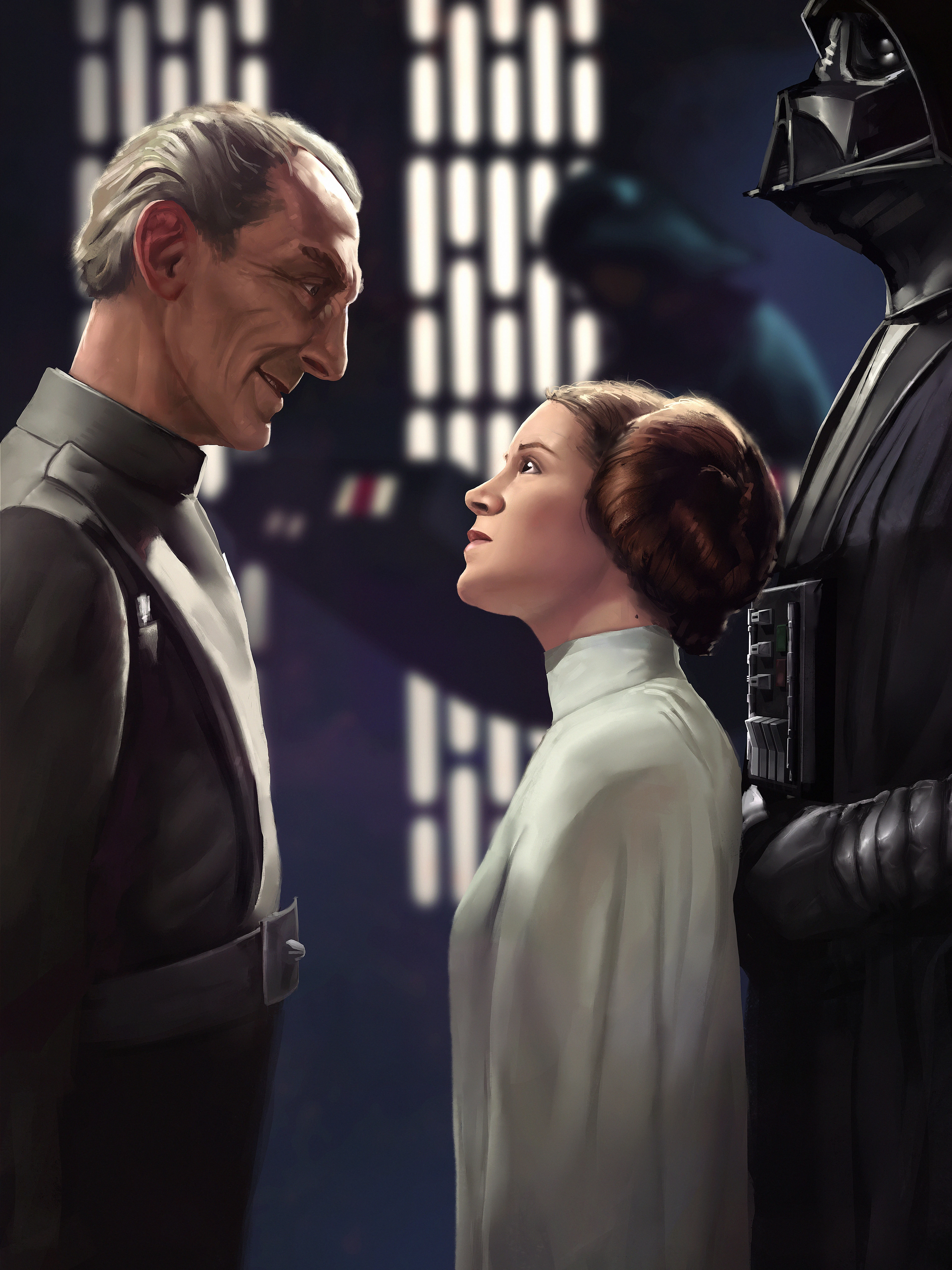Once warned to stay away from Wilhuff Tarkin by her father, the Grand Moff made an official visit to Alderaan when she was thirteen. Leia crept along the halls of the palace behind the two men, listening to their cold, tense conversation. During the occasion, she realized he was nothing more than a merciless murderer and slaver.[34]
