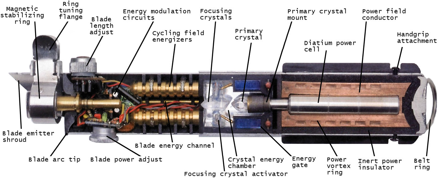 - "The components are fairly simple. Every lightsaber has a standard power source, the same type used in small blasters, even in glowpanels. They last a long time, though, because Jedi should rarely use their lightsabers. […] One of the other crucial pieces is a focusing crystal. The most powerful and sought-after gems are rare Kaiburr crystals. However, though lightsabers are powerful weapons, their design is so flexible that practically any kind of crystal can be used."