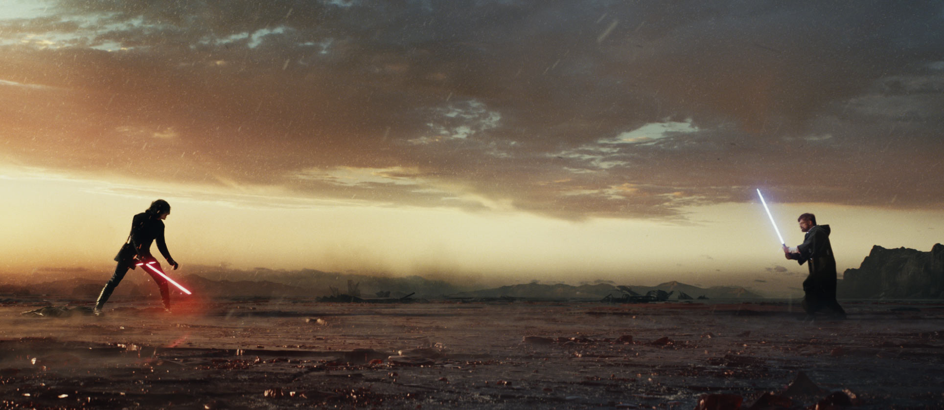 Jedi Master Obi-Wan Kenobi and Darth Vader engaged in lightsaber combat on Mustafar.