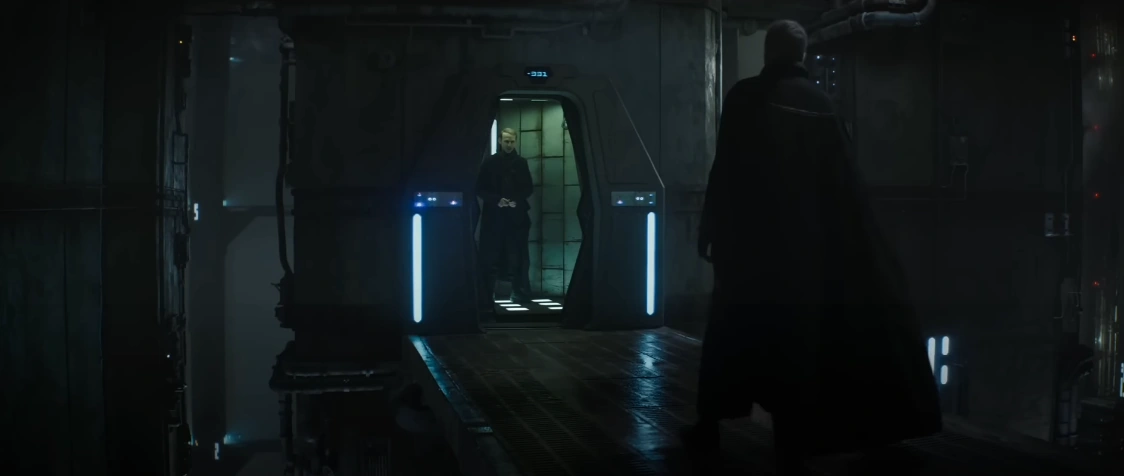 Jung speaks to Luthen Rael from the lift.
