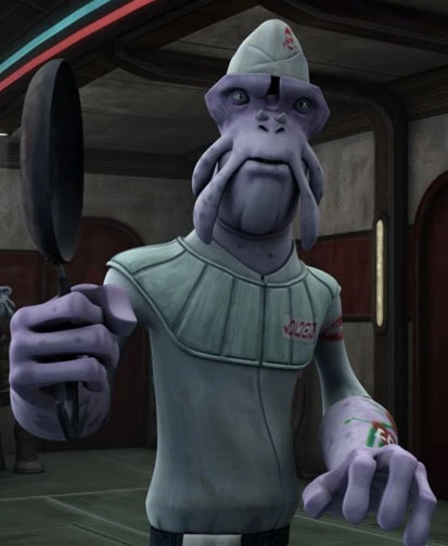 When Anakin Skywalker and his Padawan Ahsoka Tano arrived at the diner, Loubo, justifiably fearing for the life of his staff from the earlier event, tried to defend his diner with a frying pan, although the security droids talked him out of it, citing that it's a useless weapon against a Jedi. After the misunderstanding was resolved, he offered them meals "on the house," as compensation.