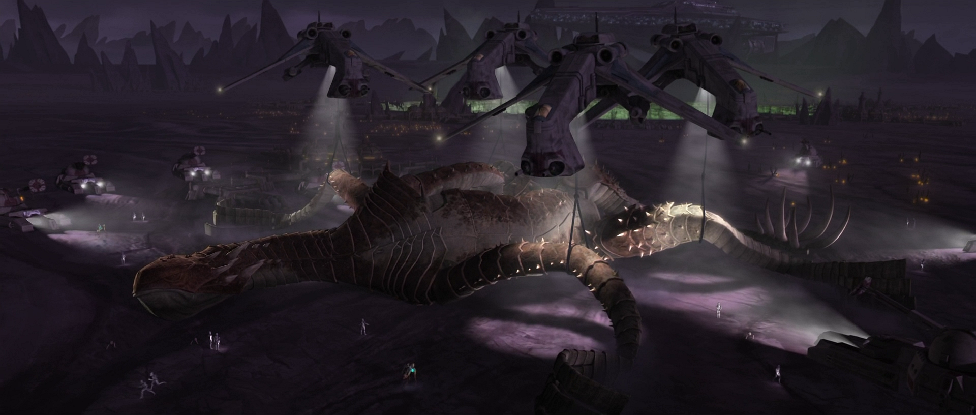 When an enormous Zillo Beast was subdued after the Battle of Malastare, a flight of four LAAT/c gunships were used to airlift the unconscious beast to a transport.[5] Numerous dropships were used to deliver All Terrain Recon Transports and AT-TEs to the surface of Kiros during the Battle of Kiros[13] around 21 BBY.[14] Several LAAT carriers participated in the Battle of Sarrish in 20 BBY, deploying AT-TEs onto the battlefield.[15]
