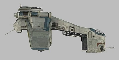 A repulsorlift gunship measuring 28.82 meters long,[2] the Low Altitude Assault Transport/carrier, or LAAT/c, was a carrier model of the Low Altitude Assault Transport series of gunships. Like the more common Low Altitude Assault Transport/infantry,[8] the LAAT/c featured two long wings located at the rear of the craft, and the body of the gunship was considerably thinner than the LAAT/i. A single pilot manned the cockpit in the front of the vehicle, which was considerably wider and taller than the rest of the body, and the front featured two light laser cannons for defense.[1] Two large cylindrical engines topped the LAAT/c's wings where they joined the body, and the gunship's two magnetic clamp arms were attached to the body underneath the wings.[4] The gunship, which could travel at a maximum speed of 620 kilometers per hour, used its magnetic clamps to ferry a wide variety of ground vehicles to and from assault ships and transports in orbit.[8]
