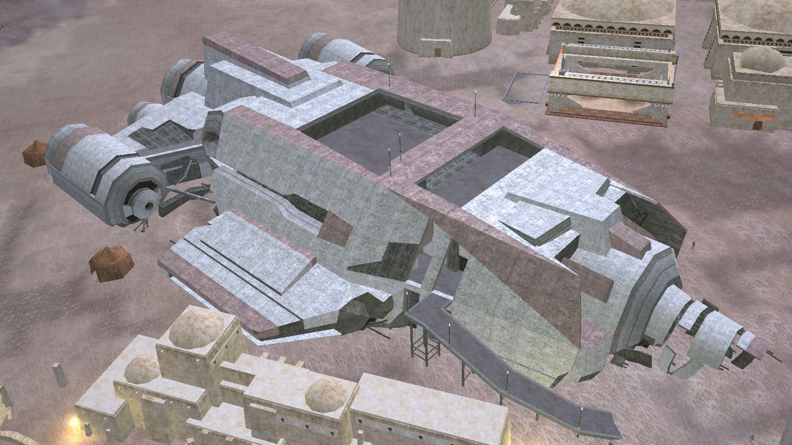 Later, the Lucky Despot was converted into a hotel because it was no longer capable of flight. A consortium of offworlders purchased the hulk and towed it to a new location, half-buried it in dirt, and rebuilt the interior. The new hotel opened shortly before Boonta's Eve. It made a profit for a decade, falling into bankruptcy and closure with the decline of podracing during the Clone Wars and the arrival of largely criminal patronage.