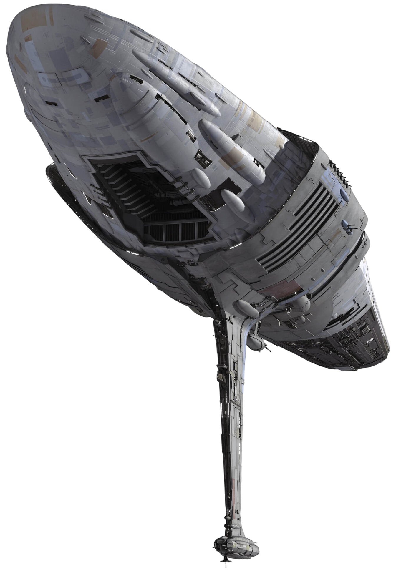 An armored outrigger fin on the ventral hull held the command bridge pod and receiver array, opposite a dorsal communications transmission mast and sensor cluster. These blade-like fins, coupled with the vessel's tapered profile, were design choices intended to trigger primal fears of predatory fish among the aquatic Mon Calamari. Next to the rear of the ventral outrigger fin was an ordnance pod. The city-ship's former civic atrium was hollowed out and converted into a docking bay and starship service area, overseen by a hangar traffic control suite protected by overlapping shields and magnetic containment fields to keep oxygen and pressure regulated.[1] The docking bay and service area was capable of accommodating ships up to corvette size.[4]
