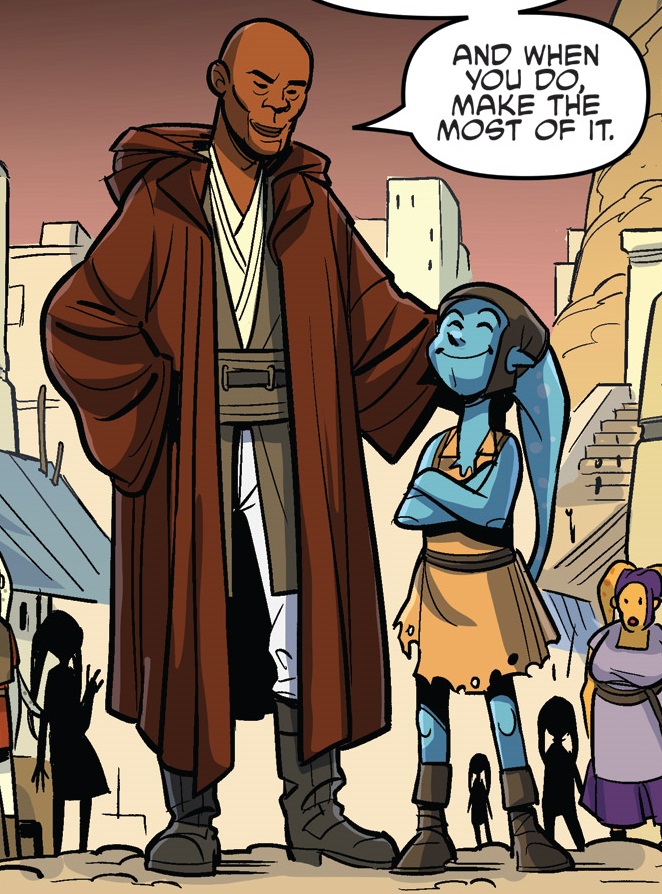 Following his early trials as a youngling, Windu attained the status of Padawan by becoming Jedi Master Cyslin Myr's apprentice. During Windu's apprenticeship, a man named Drooz had taken residence in a Jedi outreach temple on the planet Mathas. With the local populace suffering from the effects of the Niffin plague, Drooz convinced the people that he was a Jedi prophet who could heal the sick and the dying in return for their faith and servitude. Upon receiving reports of Drooz's activities, the Order dispatched Myr to assess and apprehend him. At the same time, Myr sought to teach Windu how to channel his frustrations into an appropriate emotion and therefore brought him to Mathas.[6]