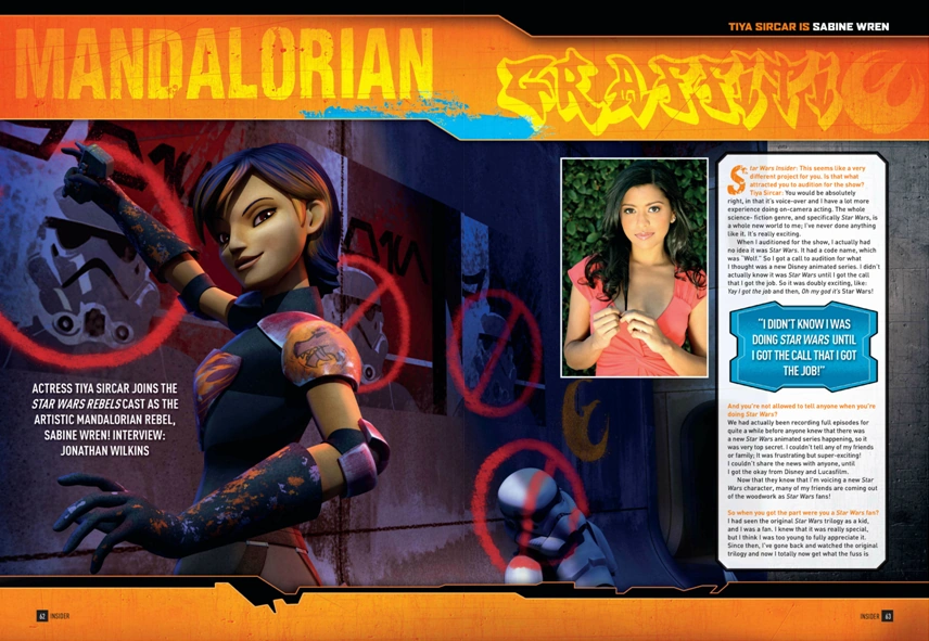 "Mandalorian Graffiti: Tiya Sircar is Sabine Wren" is an interview with Tiya Sircar who voices Sabine Wren in the TV series Star Wars Rebels. It was conducted by Jonathan Wilkins and appeared in Star Wars Insider 152.