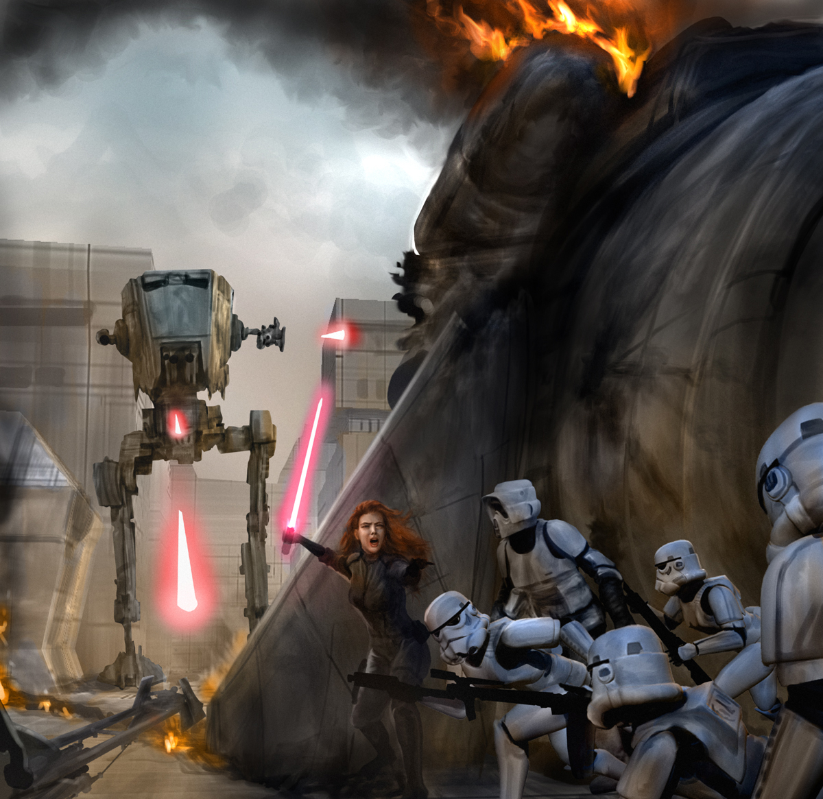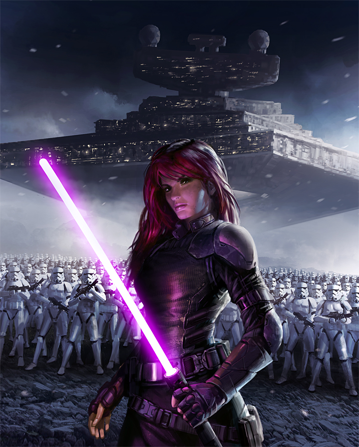 Jade arrived on Gepparin and was brought to meet the Commodore, who was suspicious of her. That evening, Jade was attacked by the two ISB men, who had been ordered to eliminate her, and their attack attracted the pirates' attention. She attempted to deal with the commodore, who ignored her and had his pirate accomplice Caaldra kill her. His attempt was unsuccessful, but she was interrupted before she could stop him and the commodore. Aboard the Reprisal, Ozzel and Somoril, wanting to be sure she was slain, arrived over Gepparin and launched TIE fighters and an orbital bombardment to kill Mara and the pirates. Jade quickly raced to the command center and found the commodore's body next to a HoloNet message he was about to send to Shelkonwa. She shot down the TIE fighters, and the Reprisal left in pursuit of the Millennium Falcon and their rogue stormtroopers who had appeared in-system, allowing her to escape in a Z-10 Seeker.[17] Journeying to Shelkonwa, she found Vader and the Executor already there in search of Rebel leader Leia Organa. Jade believed that Governor Barshnis Choard was a traitor, and informed Vader of her findings. The Dark Lord of the Sith brooked no interference in his search, but he did allow Jade to investigate and deal with Choard. Upon landing, Caaldra attacked her with a purloined All Terrain Scout Transport, but she was aided by the group of rogue stormtroopers, dubbed the Hand of Judgment and led by Daric LaRone. Taking them under her command, she defeated the AT-ST, unknowingly with the help of Chewbacca in a freighter, but Caaldra had escaped. With her newly drafted stormtroopers, she advanced on the governor's palace, where once again Caaldra tried to kill her. She put an end to him when he tried to shoot her and she redirected the bolt into him with her lightsaber. In the meantime, the Hand of Judgment had penetrated the governor's security. Linking back up with the Hand of Judgment, Jade arrested Governor Choard and vouched for the rogue stormtroopers, even in front of Vader. Later, she learned their true story. She let them go, but warned them to lie low and lose their Hand of Judgment name, saying she was the only Hand in the Empire.[17]