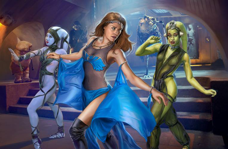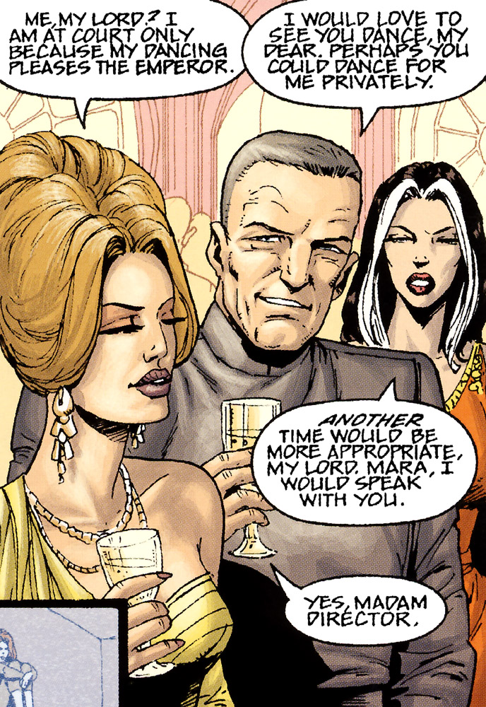 While infiltrating Jabba's Palace on Tatooine in 4 ABY, Mara adopted the disguise of a dancer named Arica Pradeux.[26] That same year, she again used the alias while investigating the motives of Imperial Councilor Raines and General Egron on Chibias.[29]
